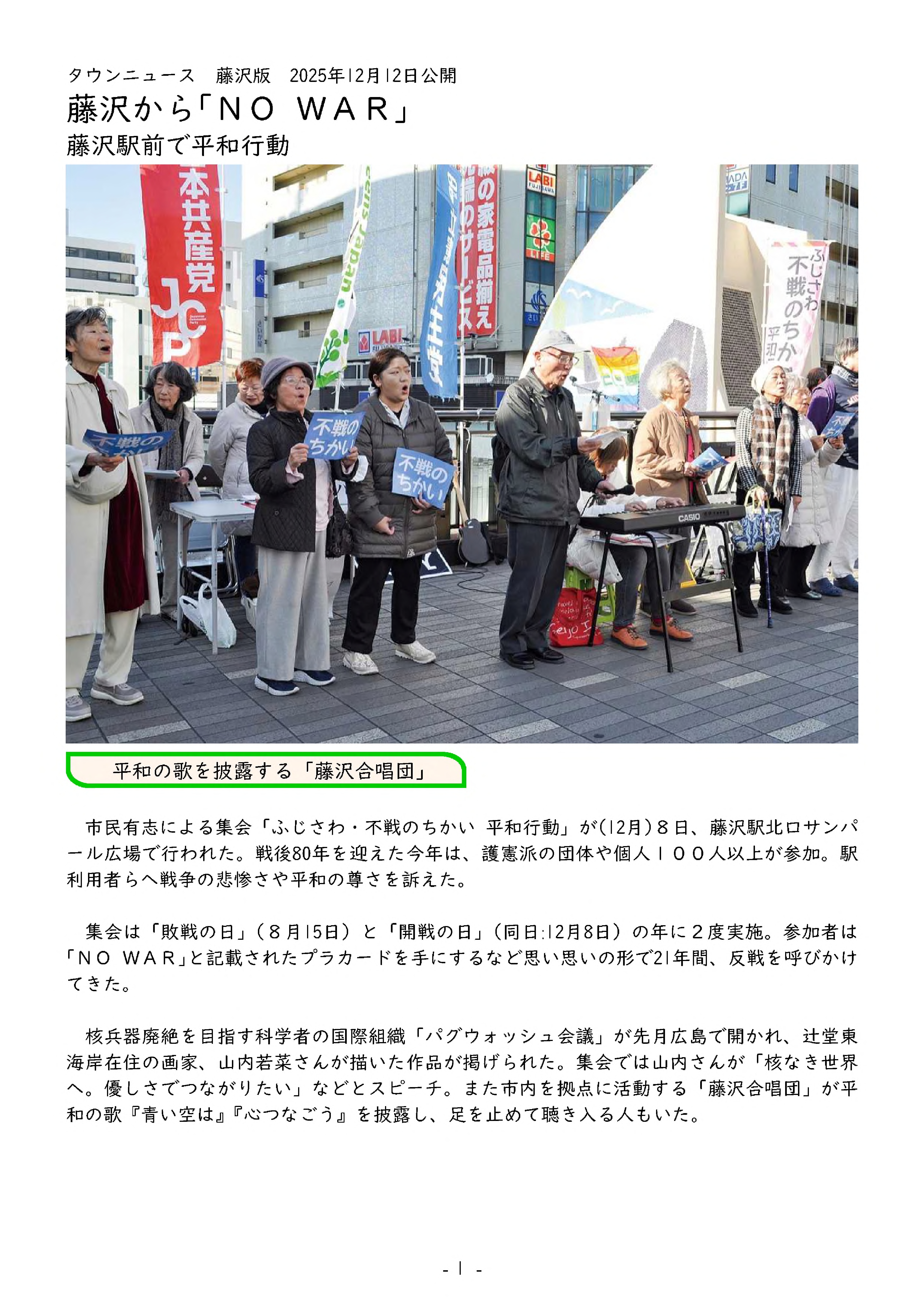 | 藤沢から「NO WAR」12月8日(月) 「ふじさわ・不戦のちかい 平和行動」 タウンニュース藤沢版掲載 |