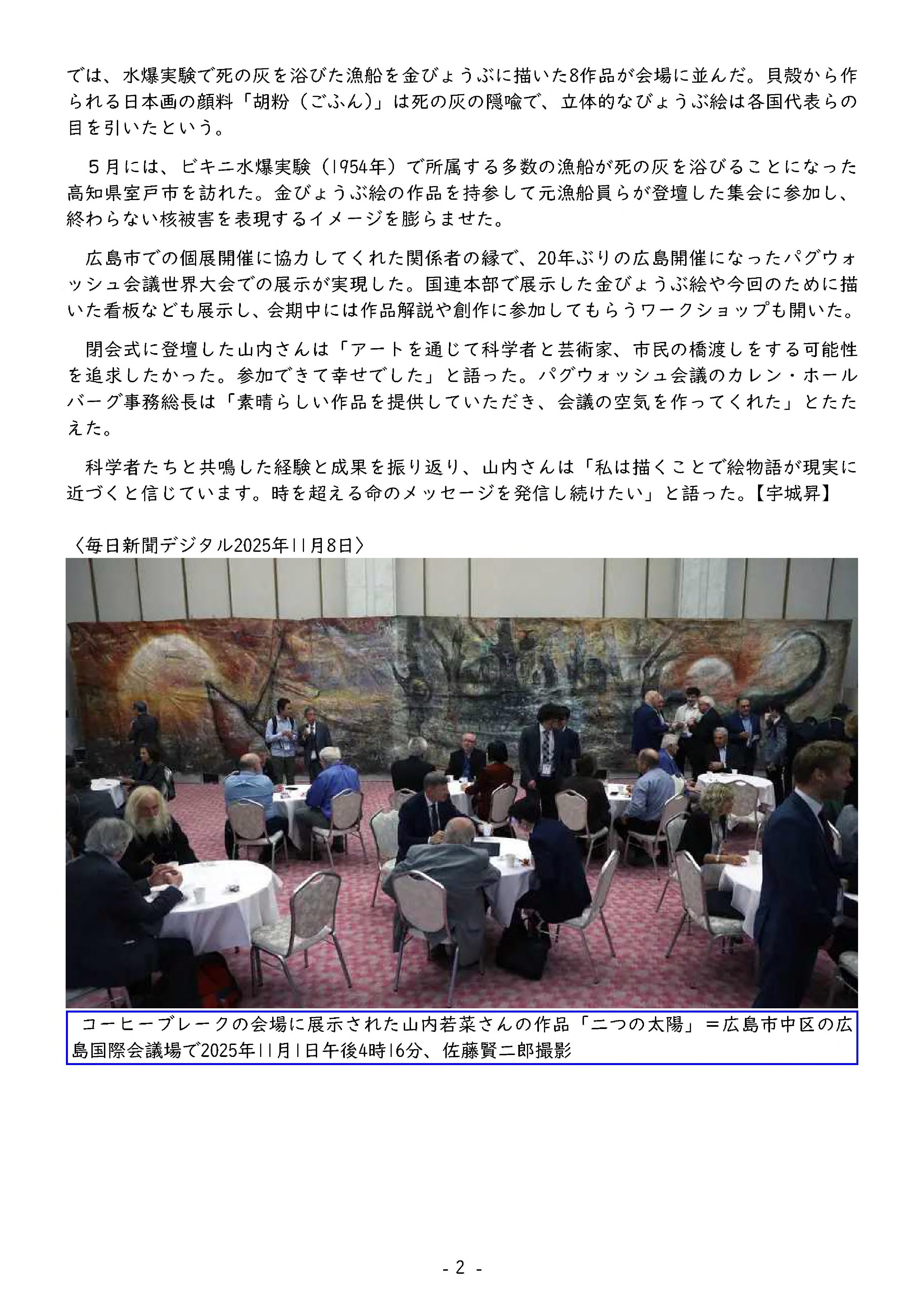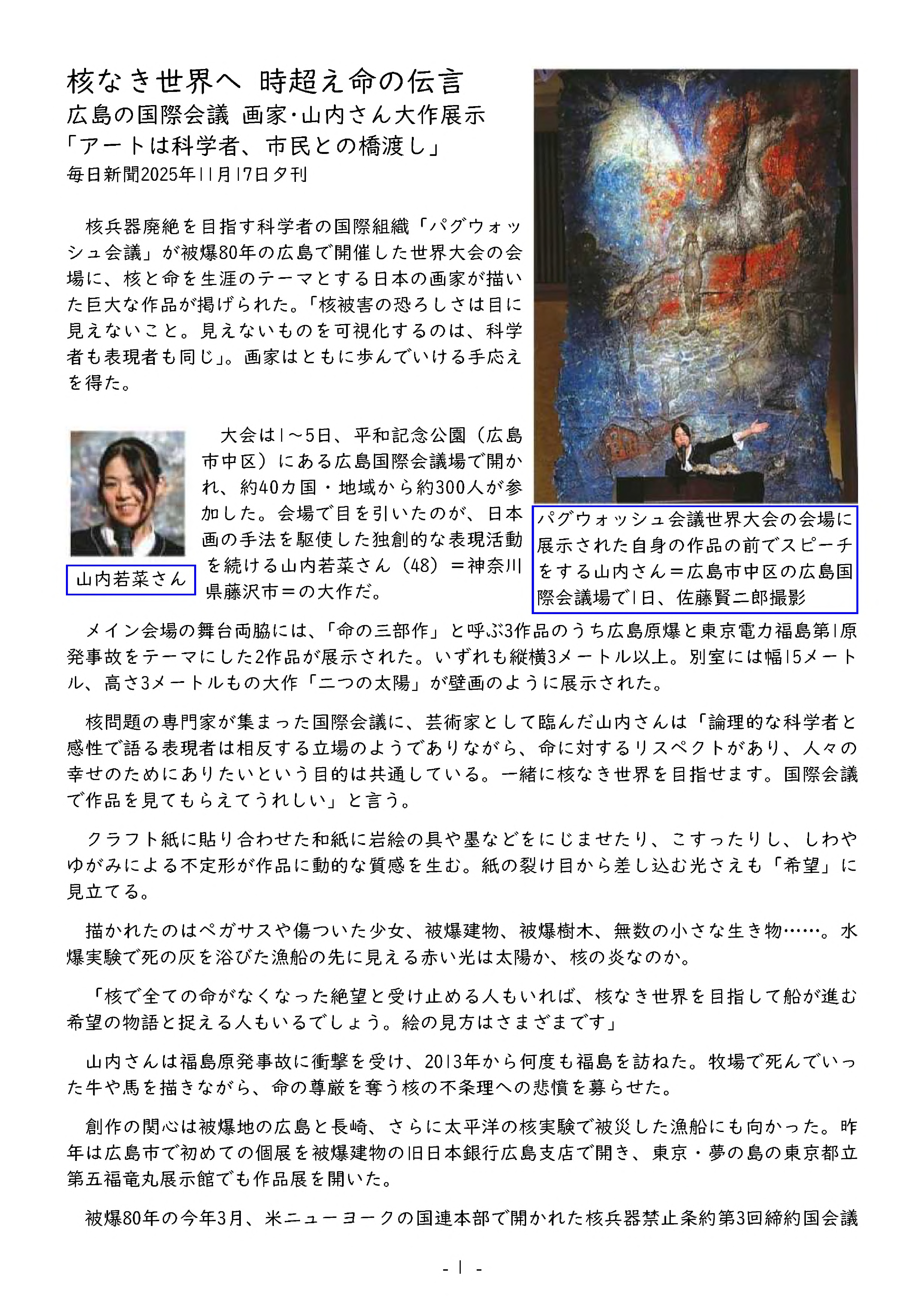 | 核なき世界へ 時超えいのちの伝言 広島の国際会議 画家・山内さんの大作展示 |
